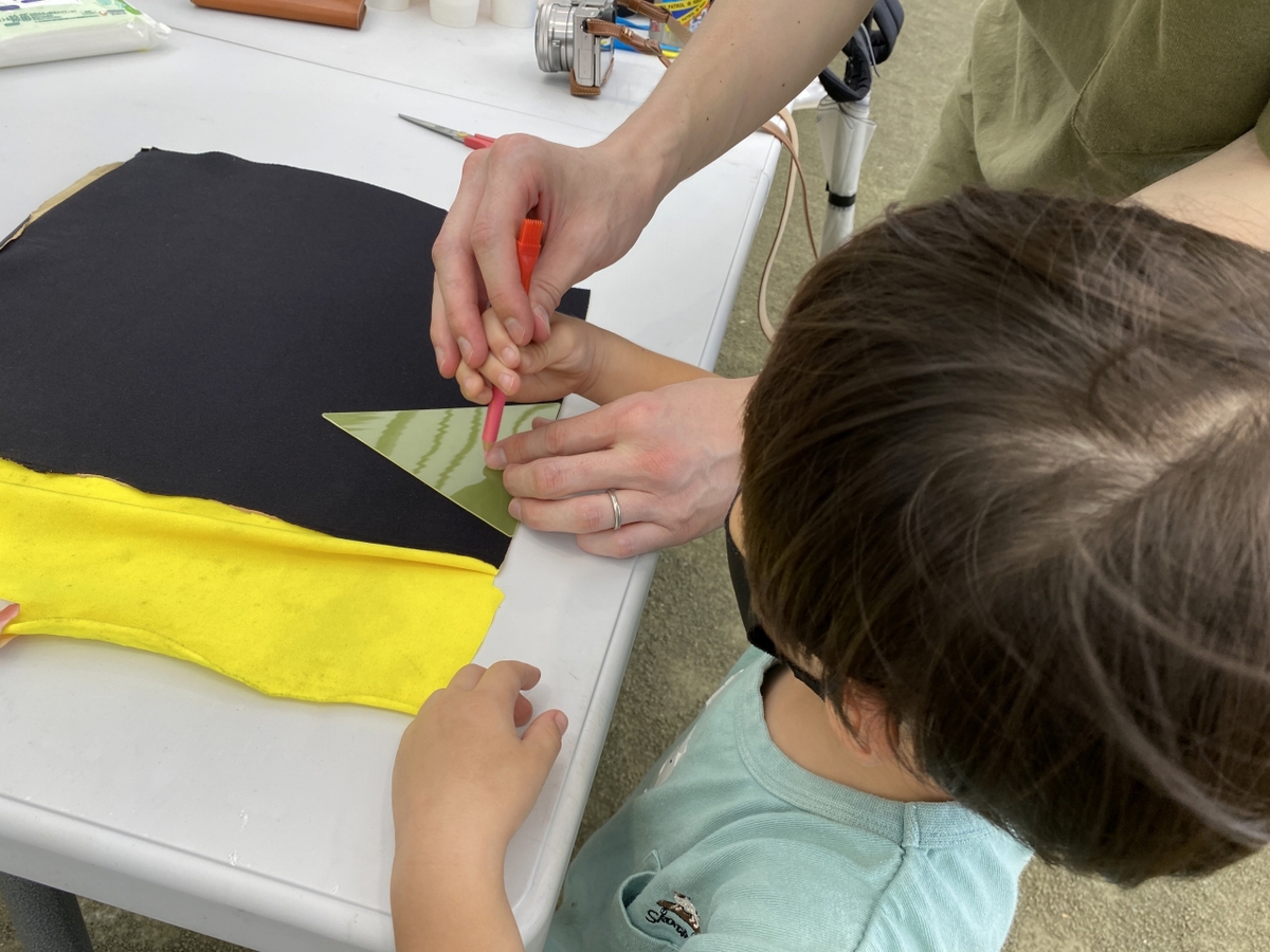 ウエットスーツの端材を再利用して、テントの飾り付けなどに使用するガーランド作りを行いました。